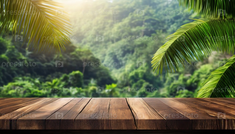 Деревянный стол с размытым фоном тропического леса и пальмовыми листьями, идеально подходит для демонстрации продуктов или приглашения на отдых и экзотические темы природы