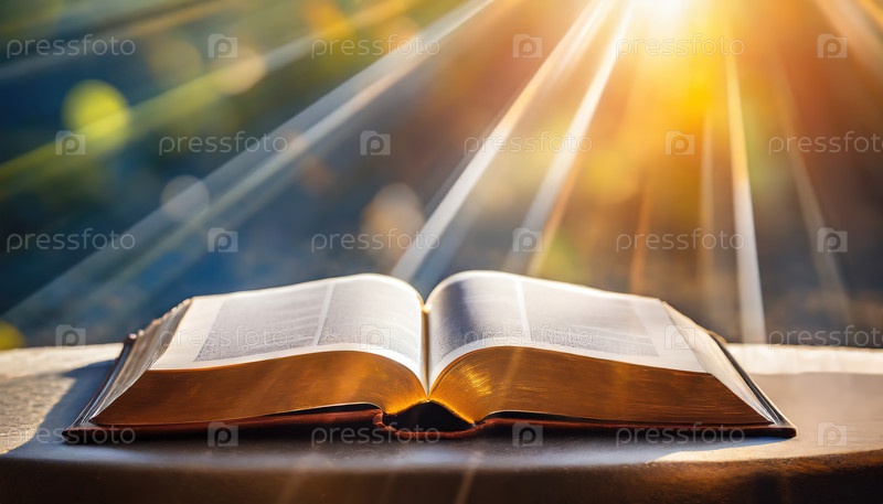 Открытая Библия излучает солнечные лучи, символизирующие божественное вдохновение, духовность, веру и надежду с небесным сиянием в мирный момент размышления