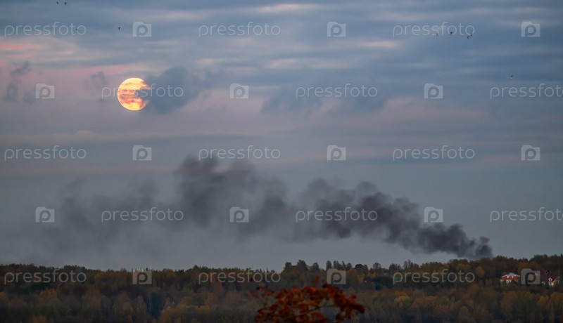 Дымный туман поднимается из огня при полнолунии в облачном небе с летающими птицами