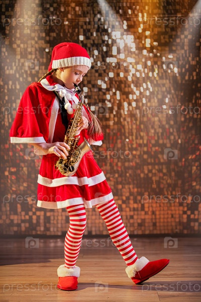Маленькая девочка в костюме Санта-Клауса играет на саксофоне Детский музыкант исполняет рождественскую песню Праздничное музыкальное представление для концепции праздника