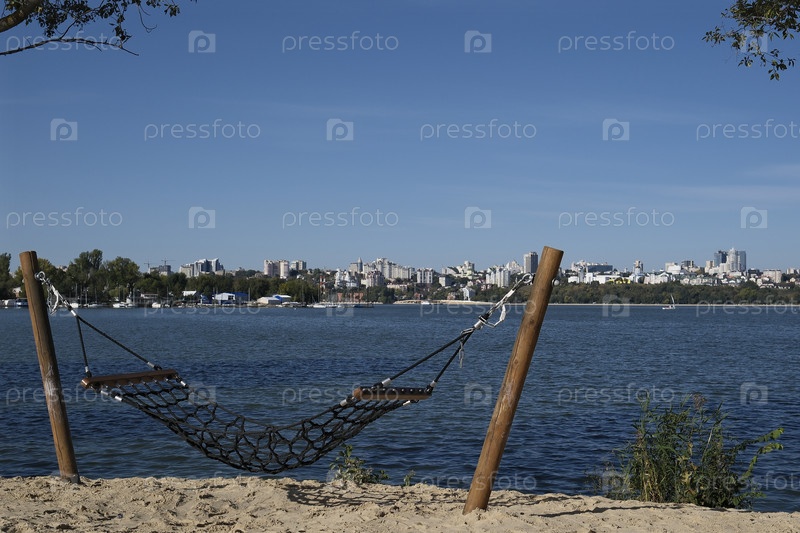 Пустой гамак на берегу водохранилища и утренний город, залитый солнцем.Россия, Воронеж, 21 сентября 2025