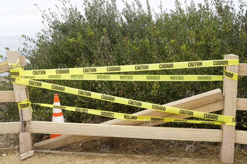 Желтая предупреждающая лента со словами 'Осторожность' на английском и испанском языках покрывает поврежденную часть забора