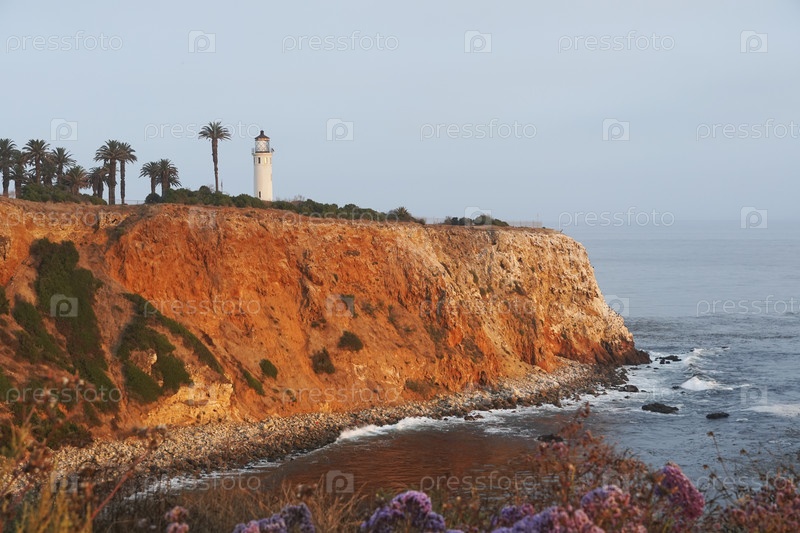 Живописный закат солнца на скалистой обрыве и маяке Пойнт-Висенте