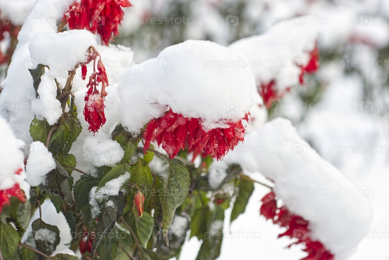 Красный цветок, покрытый снегом в зимнем лесу