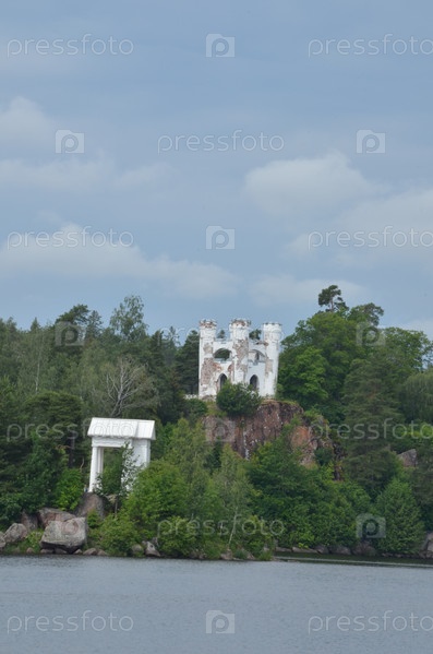 Вид на Капеллу Людвигсбурга на острове Людвигштейн и Храм Нептуна в Заливе защиты у особняка Монрепо недалеко от Выбора