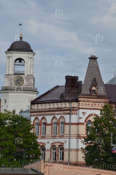 Вид на Часовую башню (здание 16-18 веков, колокольня) и исторические здания города Выборга, Ленинградская область, Дом консула Роте (педагогическая школа) в неоготическом стиле