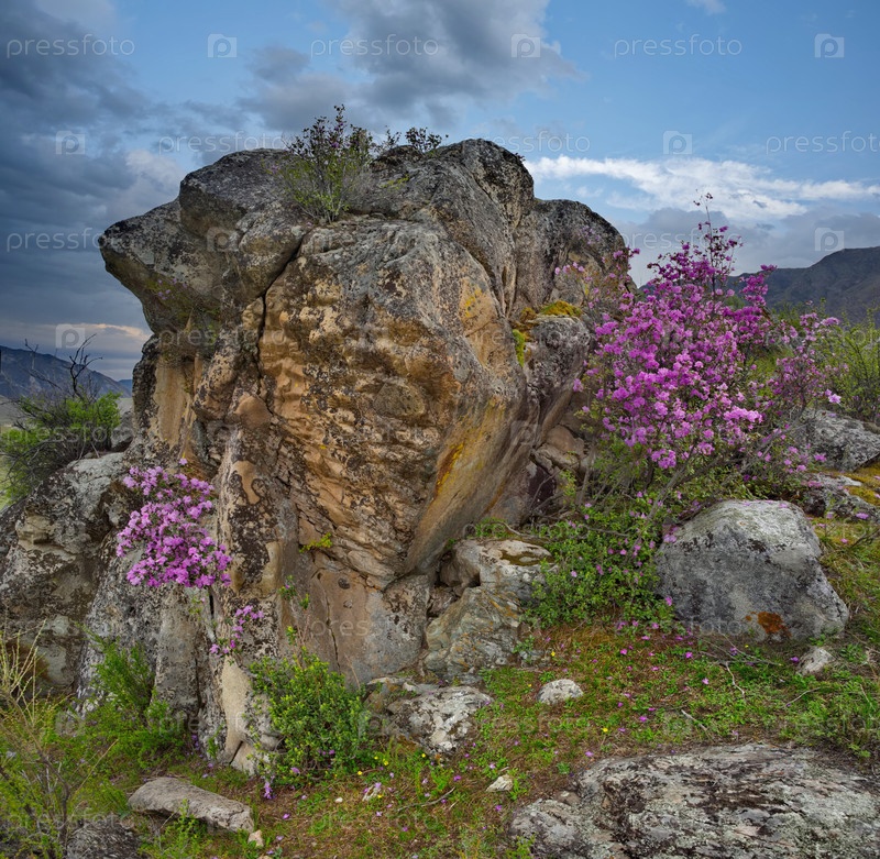 Россия. Юг Западной Сибири. Алтайские горы. Потрясающий вид на долину реки Катун с огромными скальными обломками, окруженные цветущими рододендронами
