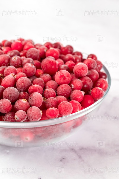 Чаша с замороженными клюквами на светлом фоне.Сохранение овощей и фруктов.Природные продукты