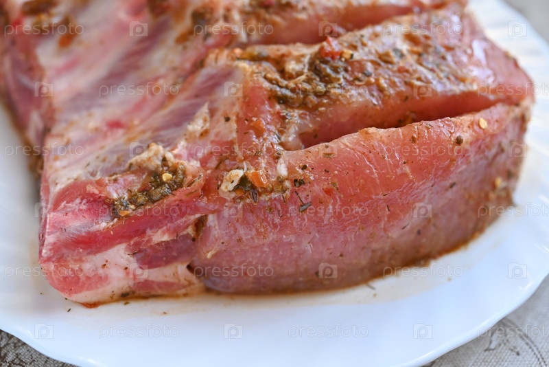 Свежие свиные ребра со специями на белой тарелке, изолированной от белого фона