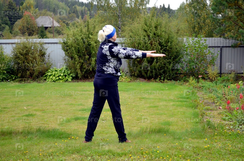 Пожилая женщина делает упражнения на свежем воздухе