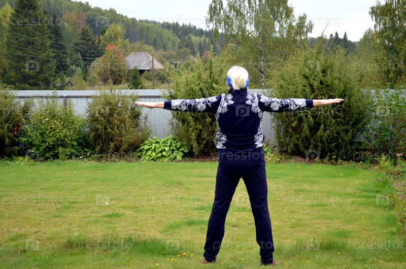 Пожилая женщина делает упражнения на свежем воздухе