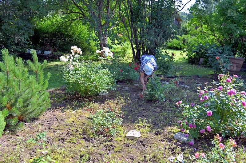Пожилая женщина заботится о розарии, отсекая и ослабляя сорняки