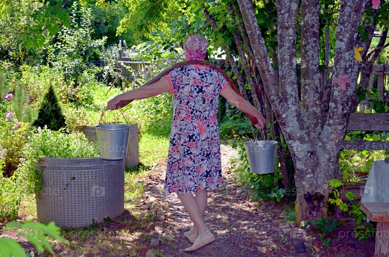 Пожилая женщина несет ведра на ведро