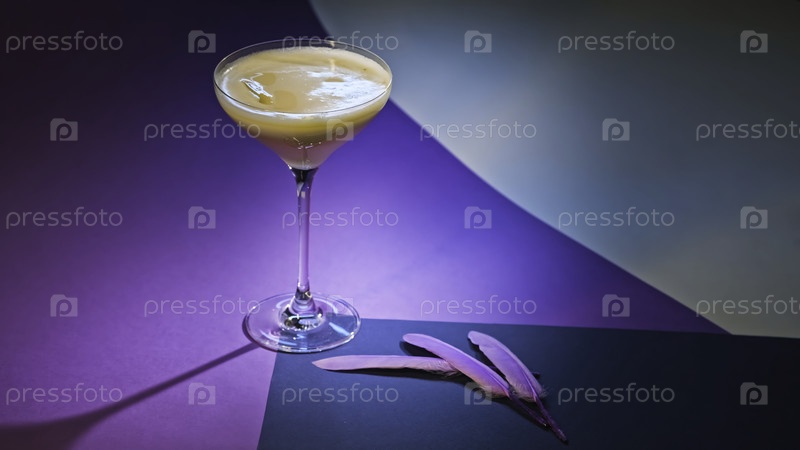 Композиция с алкогольным напитком на фиолетовом фоне. Алкогольный коктейль на элегантном фоне. Красивое украшение алкогольного напитка с перьями на фиолетовом фоне