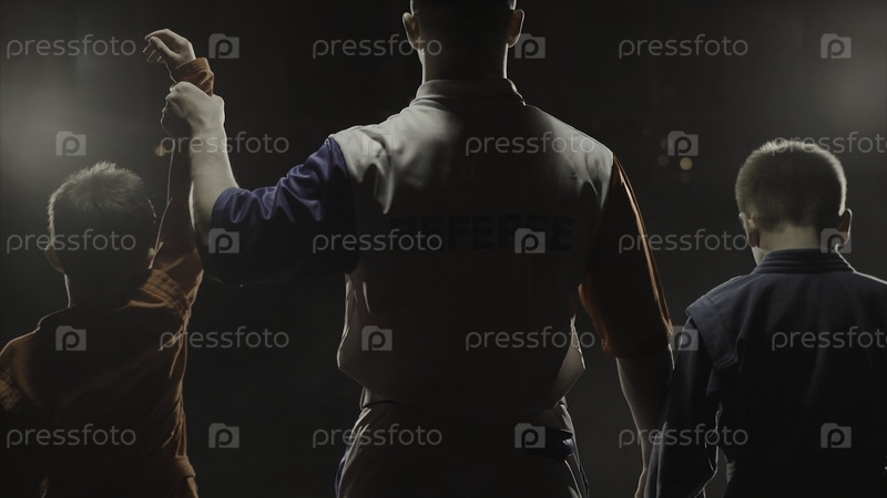 Сзади вид мальчиков-спортсменов и судьи, который поднимает руку победителя