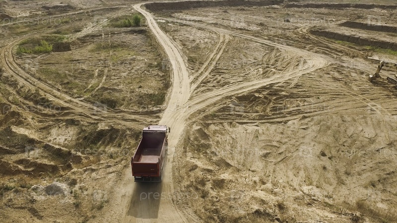 Дампер, проезжающий через зону карьера. Сцена. Вид на грузовик, едущий по необитаемой местности с пыльной поверхностью в карьере. Тяжелый транспорт для карьерных операций