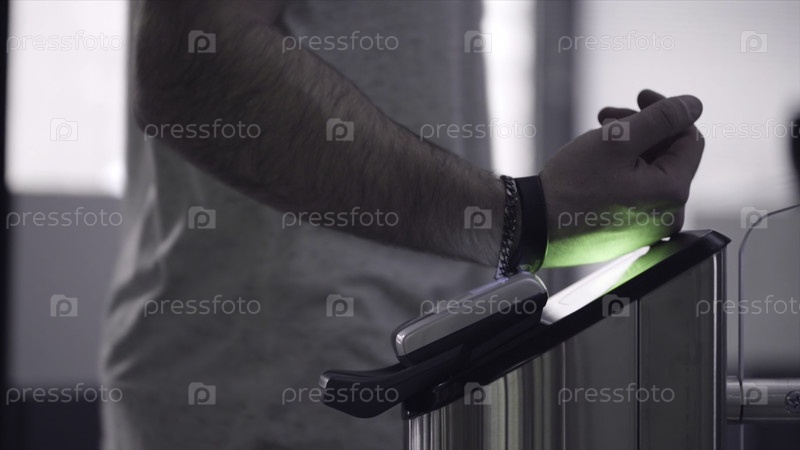 Вид сверху турникета. Электронная система контроля доступа с закрытым боковым видом. Вид сверху руки человека, применяющего пропуск на турникете