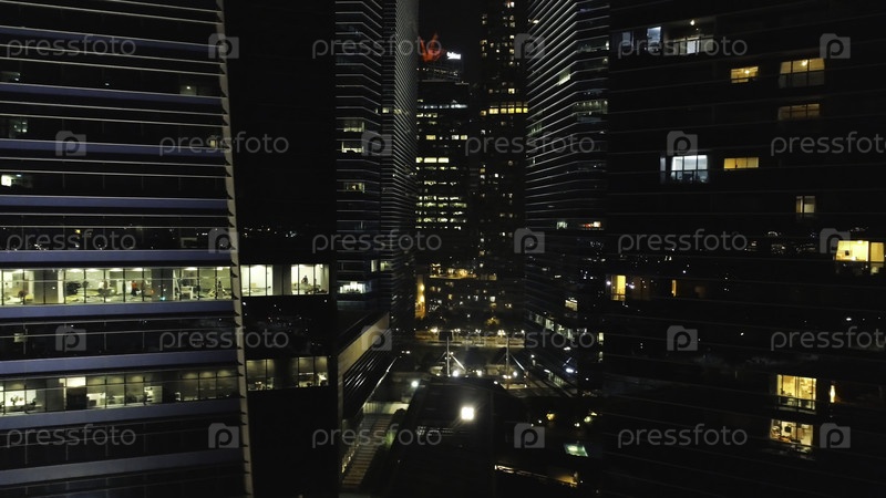 Вид на горизонт города с небоскребами в переднем плане ночью.Вид на многоэтажные здания в центре мегаполиса ночью