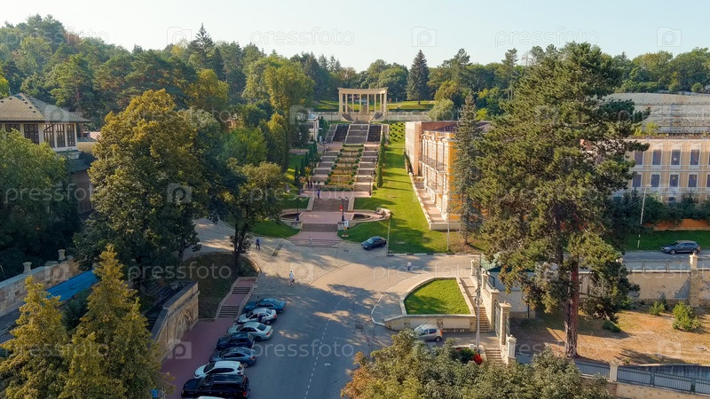 Кисловодск, Россия. Каскадная лестница. Чистое солнечное утро. Лето, вид с воздуха