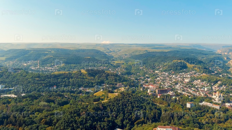 Общая панорама с видом на заснеженную гору Эльбрус, вид из воздуха