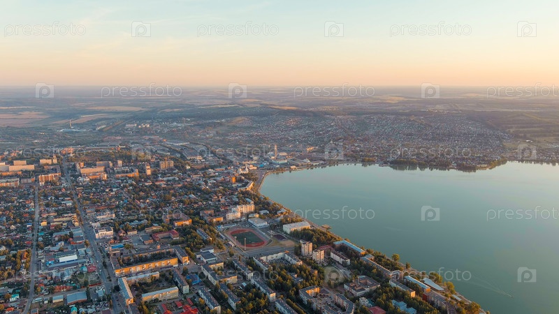 Воткинск, Россия. набережная с плотиной и заводами. Воткинск - город в Удмуртской Республике. Время захода солнца, взгляд из воздуха