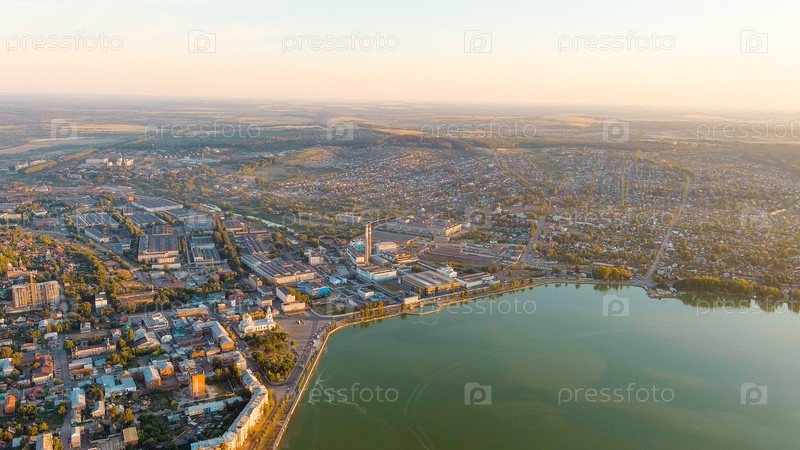 Воткинск, Россия. набережная с плотиной и заводами. Воткинск - город в Удмуртской Республике. Время захода солнца, взгляд из воздуха
