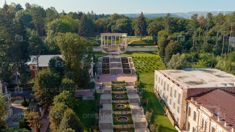 Кисловодск, Россия. Каскадная лестница. Чистое солнечное утро. Лето, вид с воздуха