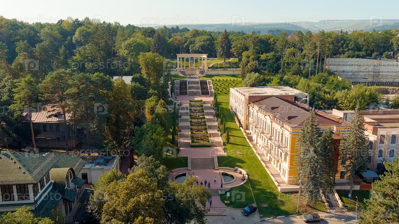 Кисловодск, Россия. Каскадная лестница. Чистое солнечное утро. Лето, вид с воздуха