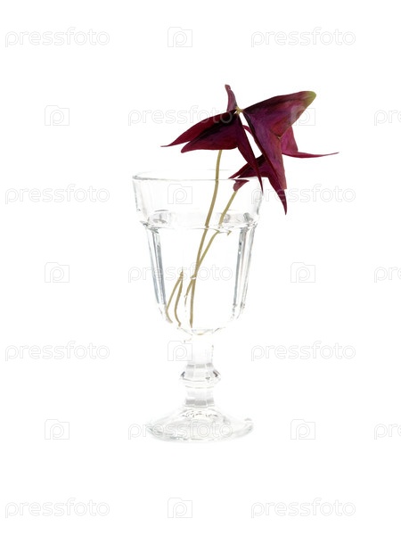 Фиолетовый оксалис треугольные листья в прозрачном винном стакане изолированы на белом фоне, чрезвычайно высокое разрешение