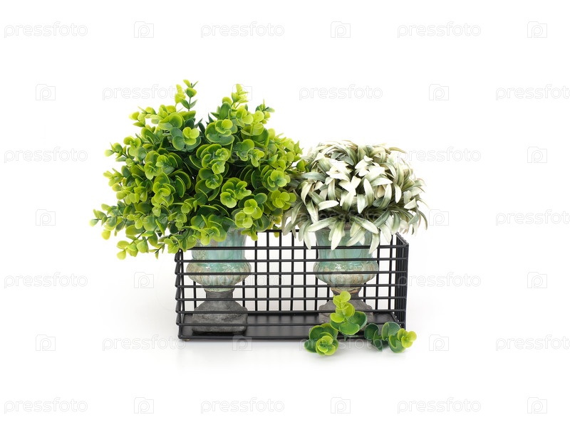 Искусственные растения в винтажных вазах со стойкой из железного металла, минималистический интерьерный декор на белом фоне