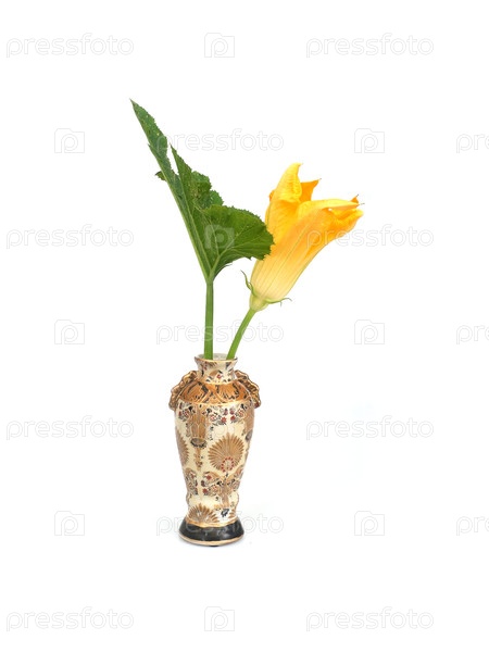 Желтый тыквенный цветок в традиционной китайской вазе выделен на белом фоне, резка готова. очень высокое разрешение