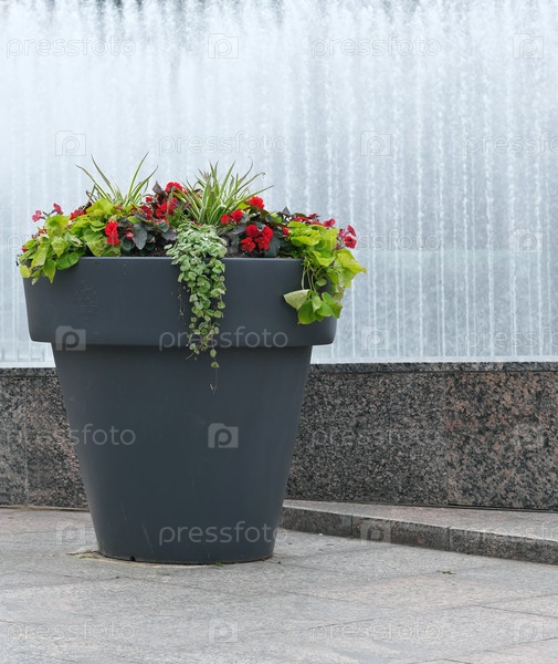 Темный цветочный горшок с яркими растениями и фоном фонтана. городской пейзаж