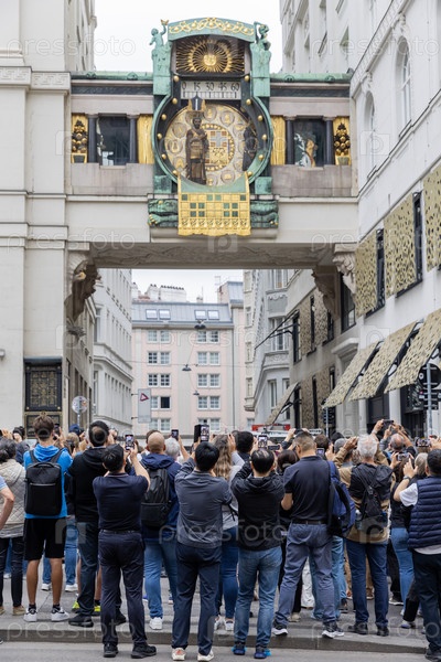 Австрия. Вена. Турист). смотрят на муз).кальн).е час). АнкерУр (Ankeruhr). Austria. Vienna. Tourists looking at the Ankeruhr musical clock