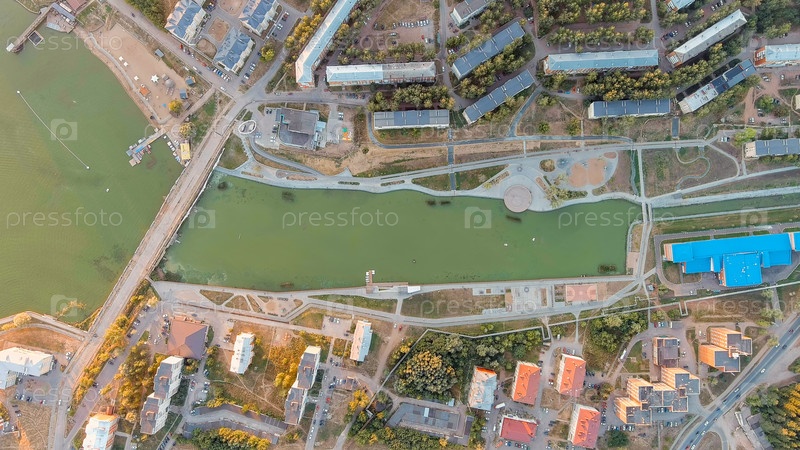 Воткинск - город в Удмуртской Республике. время захода солнца, вид с воздуха, голова над головой