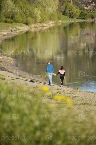Любящая пара гуляет вдоль берега реки, держась за руки. Прогулки на улице при закате солнца. Романтика и любовные отношения. Мужчина и женщина
