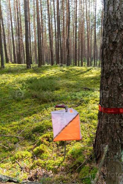 Первобытный маркер и электронный композитор в точке ориентации в подсолнечном сосновом лесу. Спорты на открытом воздухе, навигация и экологически чистая концепция