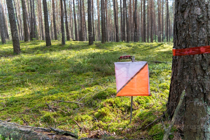 Первобытный маркер и электронный композитор в точке ориентации в подсолнечном сосновом лесу. Спорты на открытом воздухе, навигация и экологически чистая концепция