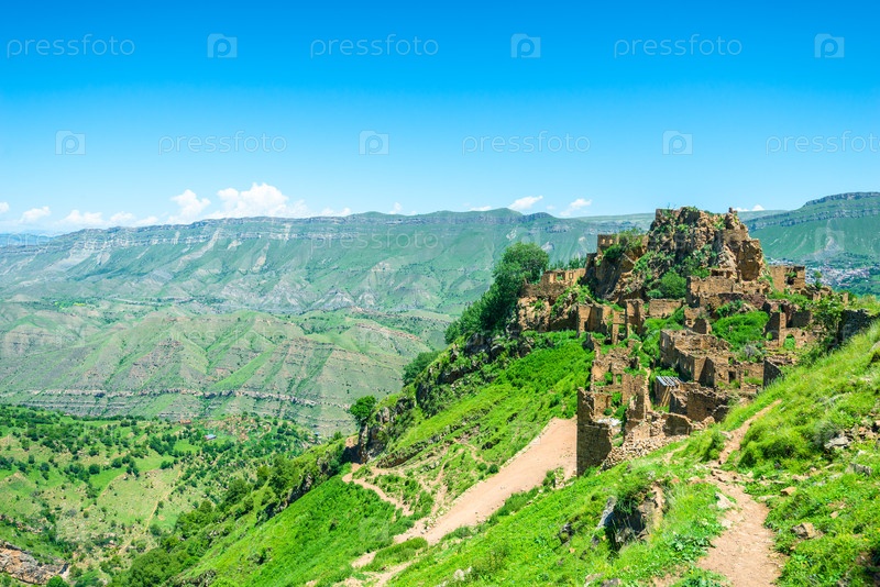 Ландшафт с тропой, ведущей к руинам горной деревни-призрака Гамсутль. Северный Кавказ