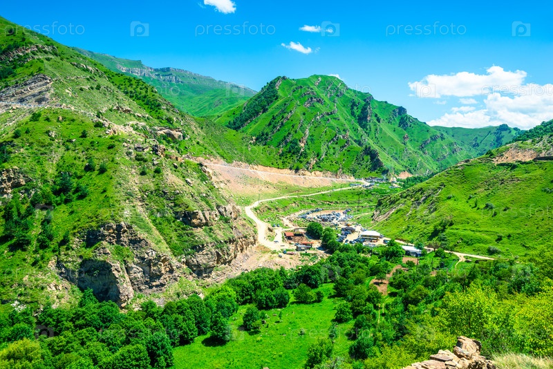 Прекрасный вид на живописную горную долину зеленых гор и горную деревню