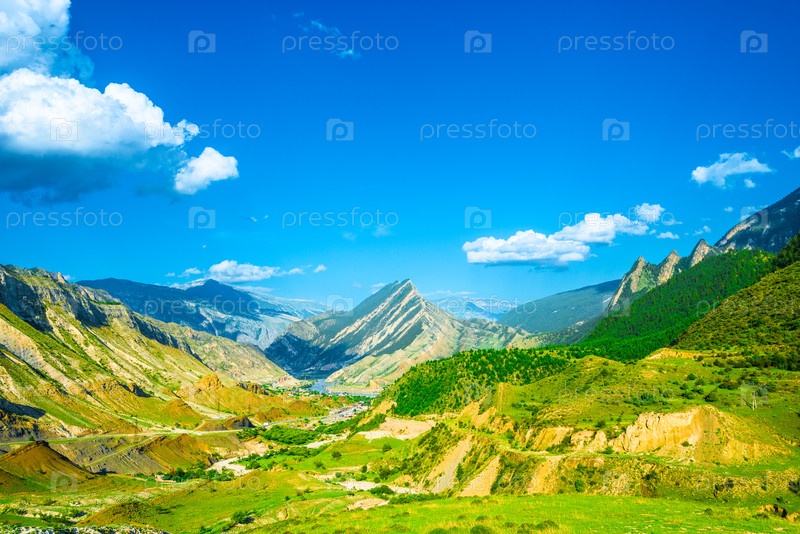 Живописный пейзаж зеленой горной долины в горах Северного Кавказа