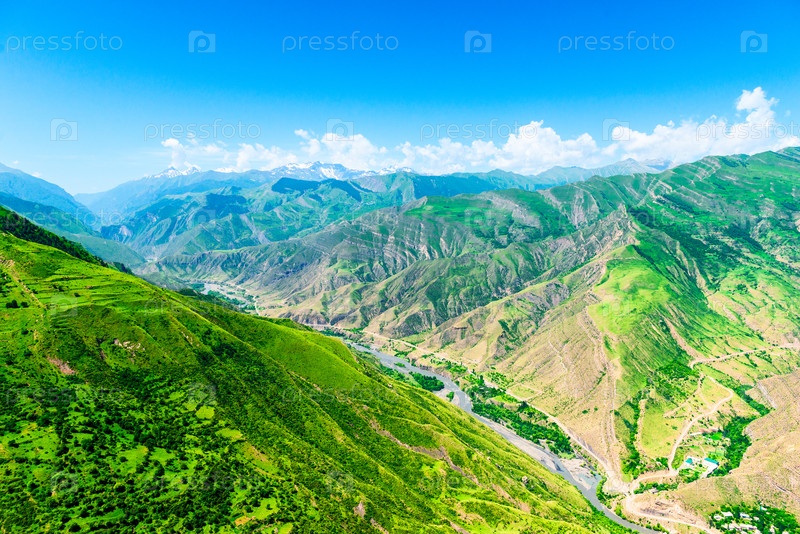 Красивый вид на живописный пейзаж каньона горной реки Аварское Койсу в горах Северного Кавказа