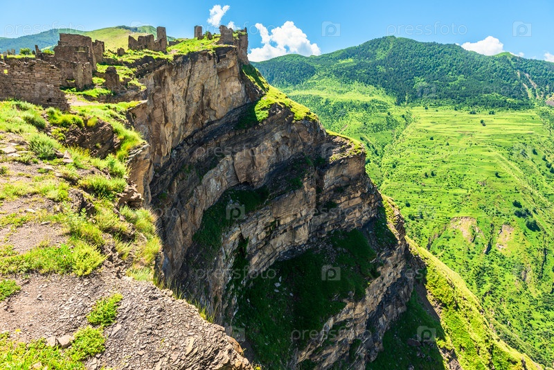 Драматический вид руин горной деревни Гор над пропастью глубокого горного ущелья на Северном Кавказе