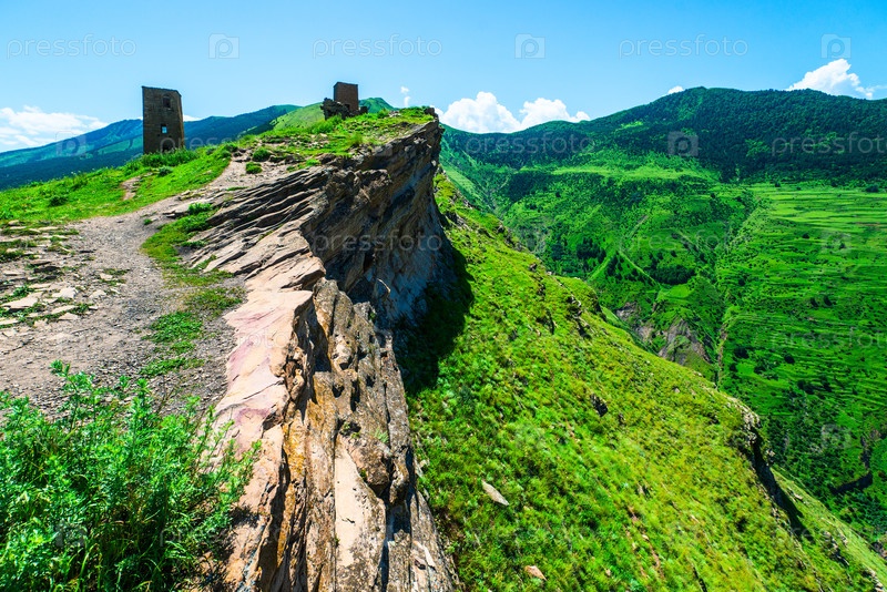 Живописный горный пейзаж с руинами древних башен на крутой скале