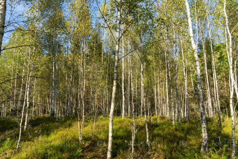 Молодой березовый лес в начале осени. солнечный день. зеленый мох покрывает землю