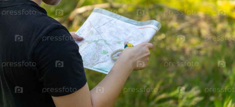 Спортсмен, бегущий по летнему лесу с картой и компасом