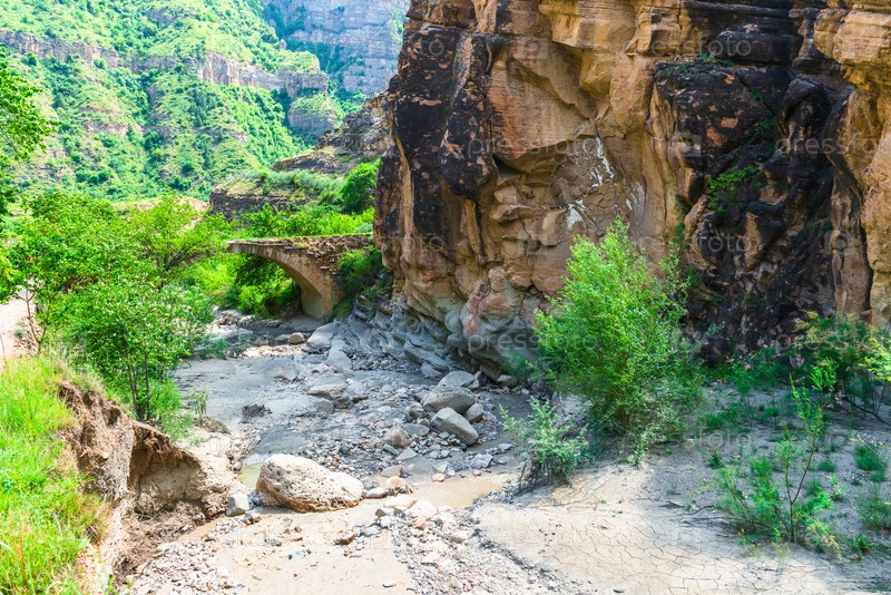 Живописный вид на древний каменный мост через скалистую горную реку у подножия скалистой горы