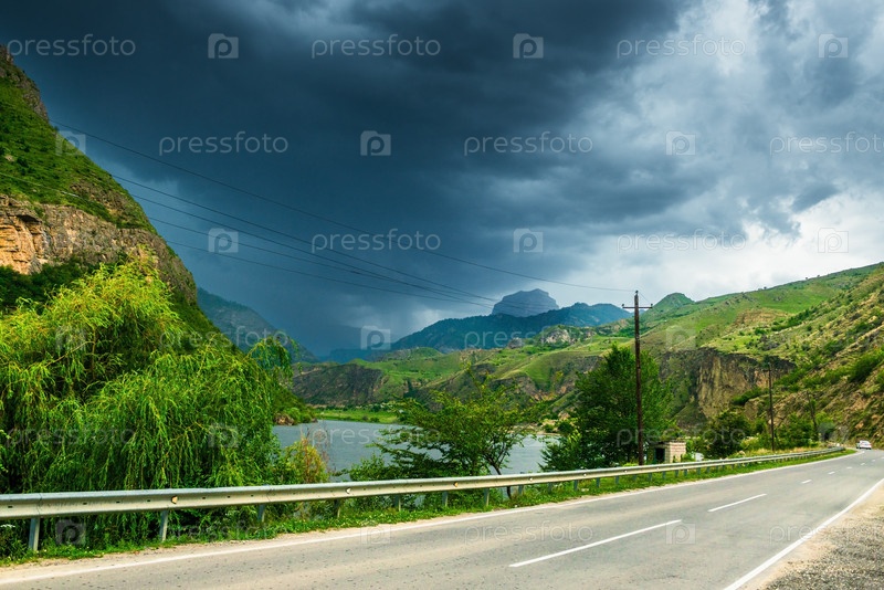 Драматический горный пейзаж с дорогой возле горного озера в бурную погоду