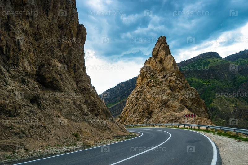 Драматический горный пейзаж с изогнутой горной дорогой на краю скалы в долине реки