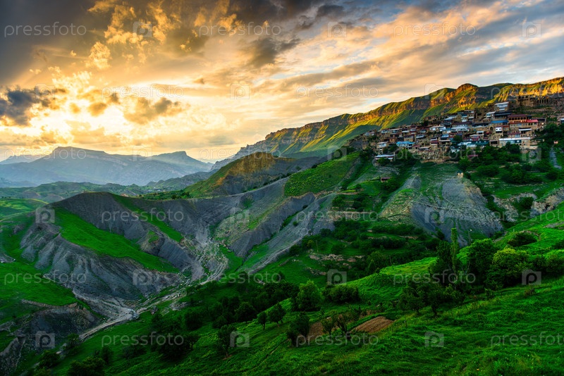 Живописный пейзаж горной деревни Чох с потрясающим закатом солнца