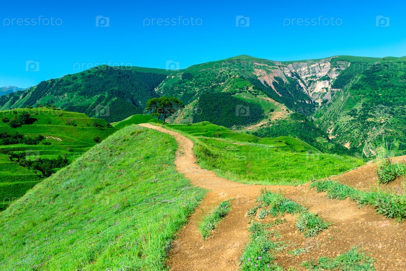 Живописный пейзаж с тропой, ведущей к одинокому дереву на фоне Кавказских гор